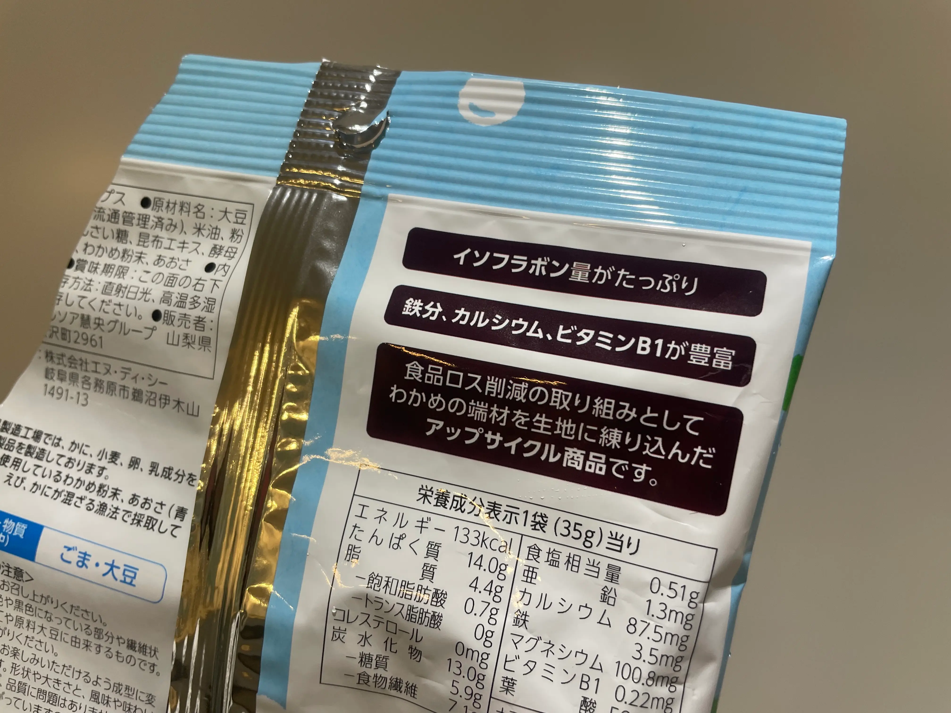 先日、おやつに買った「大豆チップス」のパッケージに「食品ロス削減の取り組みとして、わかめの端材を生地に練り込んだアップサイクル商品です。」という文言を見つけました。