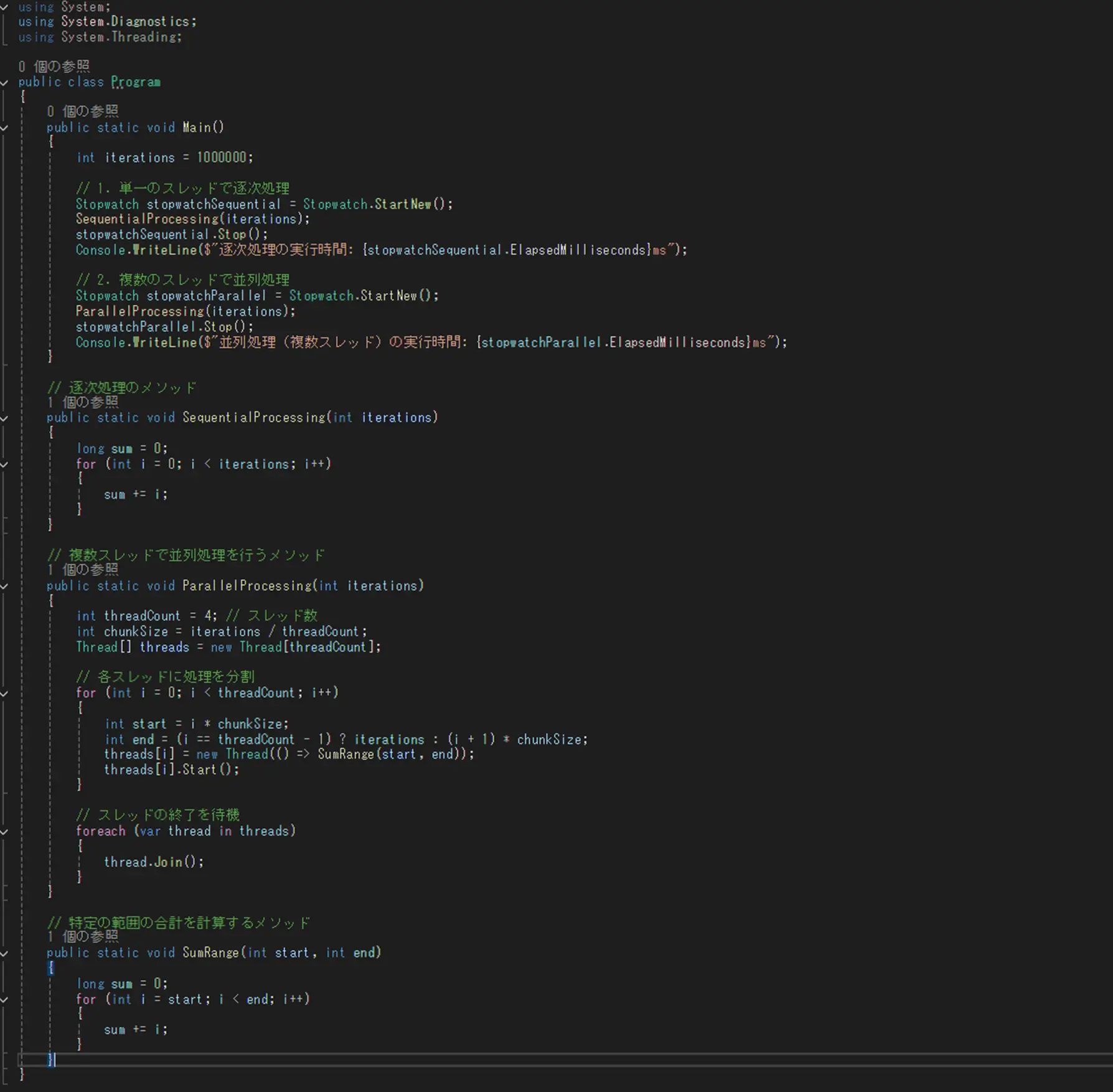 複数スレッドで処理するメソッドと単一スレッドで処理するメソッドを用意して処理時間を計測しコンソールに出力します。