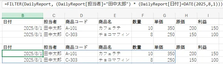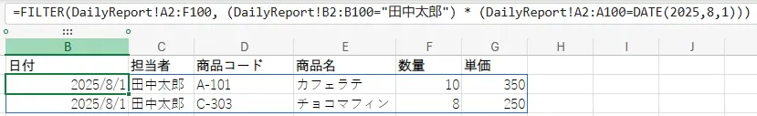 =FILTER(DailyReport!A2:F100, (DailyReport!B2:B100="田中太郎") * (DailyReport!A2:A100=DATE(2025,8,1)))