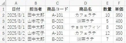 ・DailyReportシート:日付、担当者、商品コード、商品名、数量、単価などが記載された日報